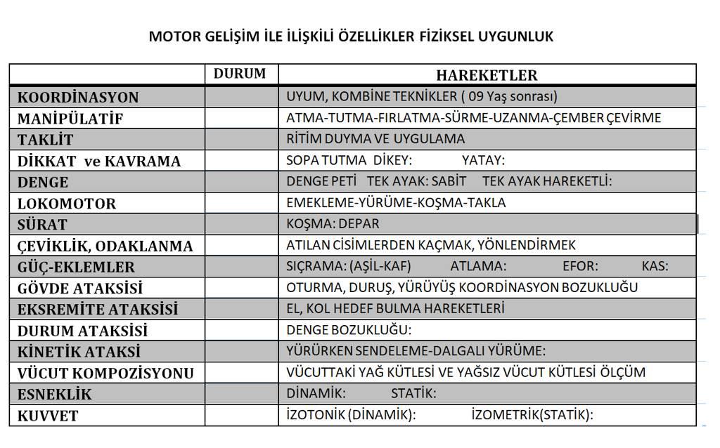 LOKOMOTOR BECERİLER: 06-16 Yaş Arası Yetenek test rapor verileri