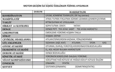 Motorsal-fiziksel: Çabukluk, dayanıklılık, denge, esneklik, koordinasyon, kuvvet, sürat